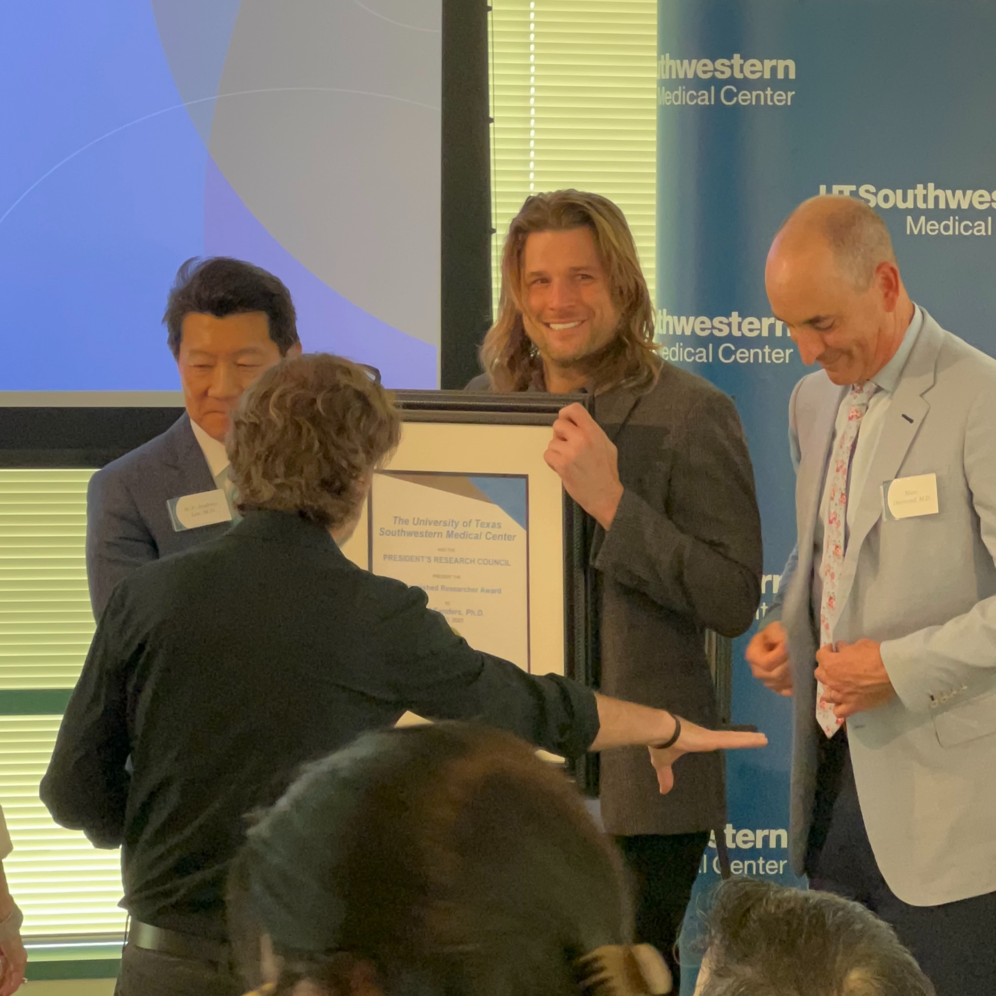 May 13, 2025: Thank you to the President’s Research Council at UT Southwestern for funding our research on neuromuscular diseases! It was a pleasure for David to meet so many enthusiastic local backers of UTSW’s research mission….and was certainly humbling to receive so much attention—nice action shot of David with our favorite Dean, Andy Lee! And Marc, sure, sure. Marc’s okay too.