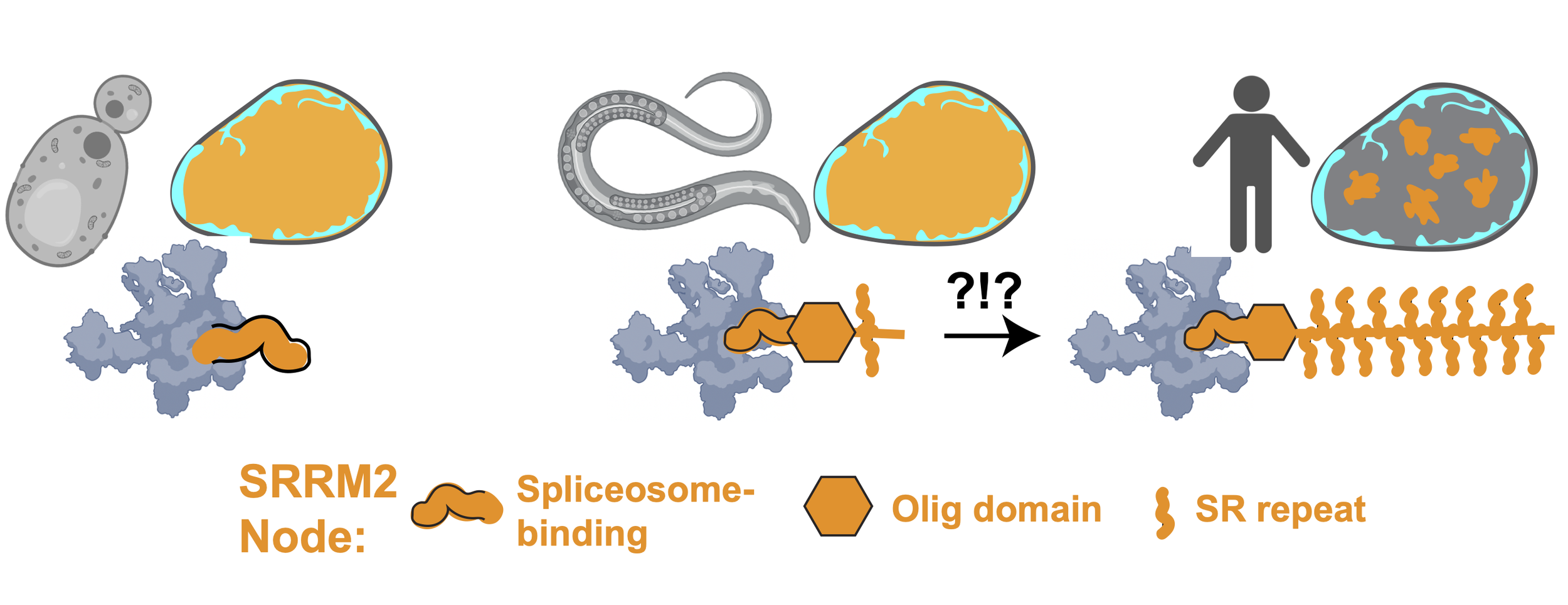Most membraneless compartments have unclear function. Acutely prominent amongst these are ‘speckles’, which cover 15% of the human cell nucleus and are present in all vertebrates but absent in simple eukaryotes (yeast, worms). Organisms with speckles have complex mRNA processing programs, which may inform function. An extreme example is that of skeletal muscle cells , which rewire mRNA processing during differentiation to stitch (‘splice’) the huge mRNAs encoding their structural proteins. To determine speckle function, methods that turn speckles on (‘assembly’) and off (‘disassembly’) are needed.
